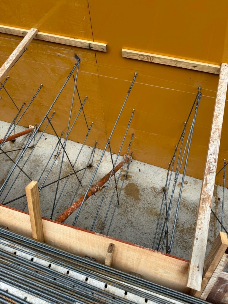 今回の擁壁工事は両側に型枠を立てるため、コンクリートを流すと内側に大きな圧力がかかります。それを抑えるのがセパレーター(セパ)です。