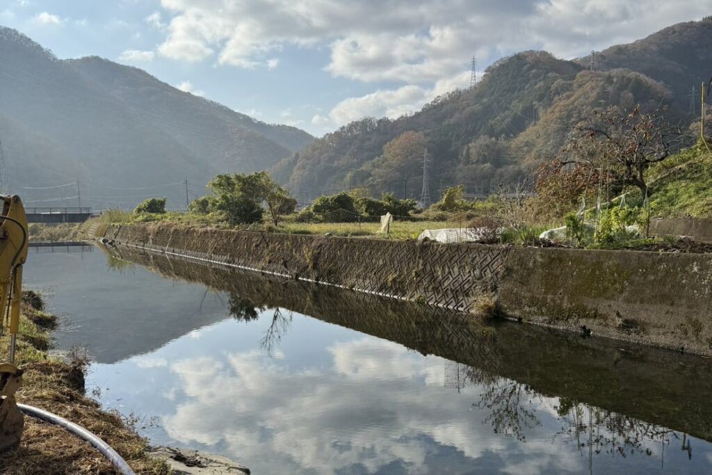 この写真は現場で見た水面に映る空です。こういう場面を美しいと思える感性を磨くのも自然と向き合う、僕たち土木の仕事には大切な習慣です。どうですか?キレイですか?