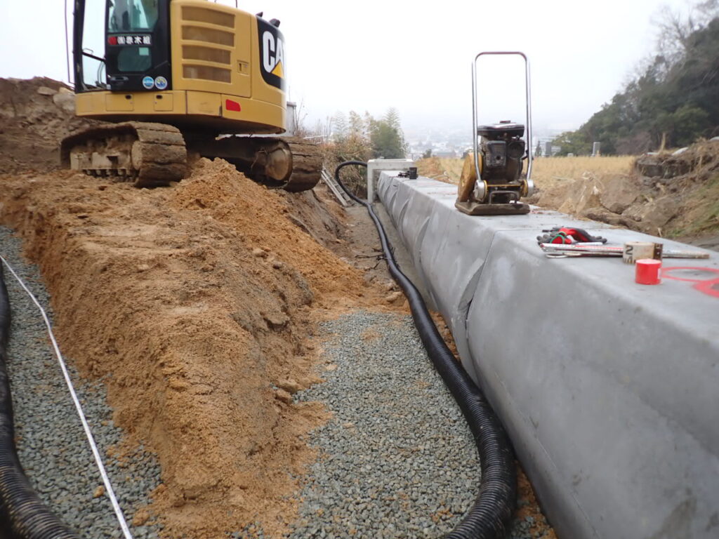 暗渠を入れる作業は、大きく分けると暗渠管・砕石・フィルター材を地中に設置し、埋めていく工程になります。